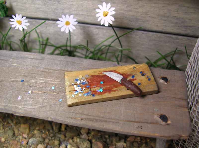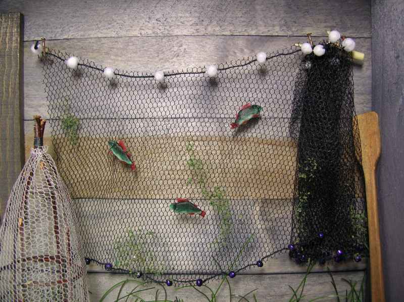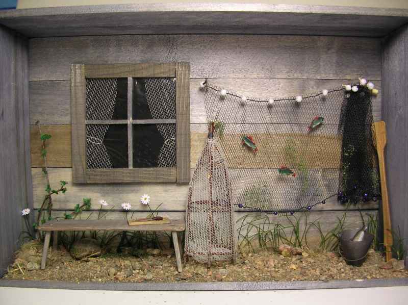 Kalamajan seinusta on tehty puiseen lahjalaatikkoon. Kalat, puukon, ämpärin ja melan olen saanut ystäviltä.