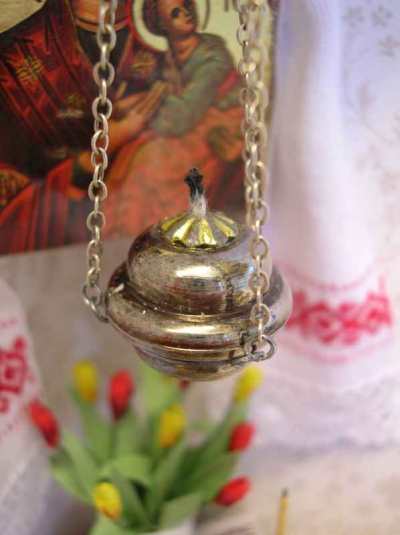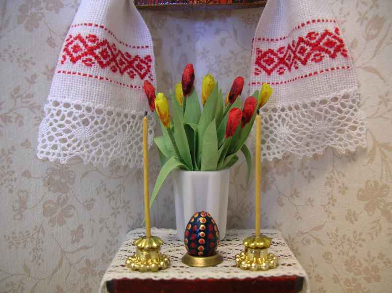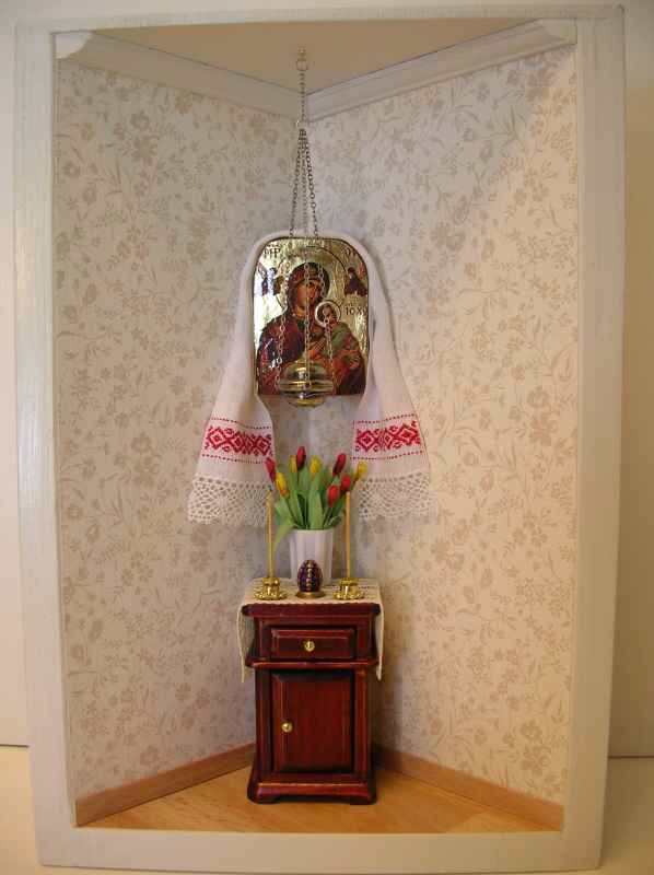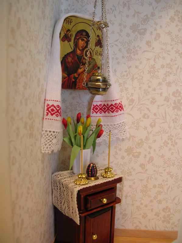Kaappi ja ikoni on ostettu, muut esineet olen tehnyt itse. Käspaikan kuvio on pujoteltu jäljitellen oikeaa punapoimintaa. Kukat ovat paperia.