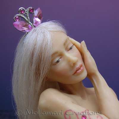 Her light strawberry red hair is soft and curly tibetan mohair, crowned