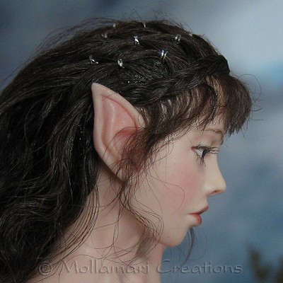 She has dark netted beautiful hair and she wears sparkling dark blue