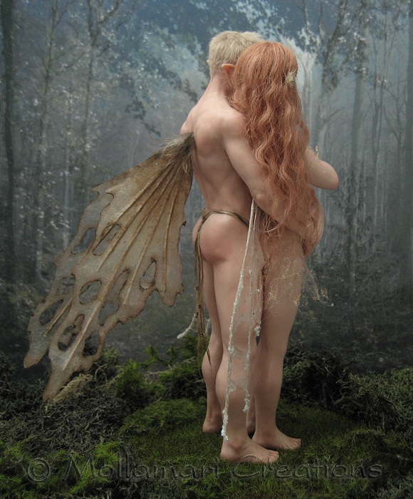 Two fairies in love, holding each others gently...